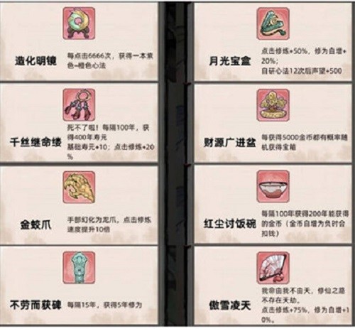 3:如果是需要自研心法的就算了,还有就是免疫天劫的扇子了,再者就是那些给宝箱给钱的,宝箱可以开除几十年修为和商店中全部会卖的东西;