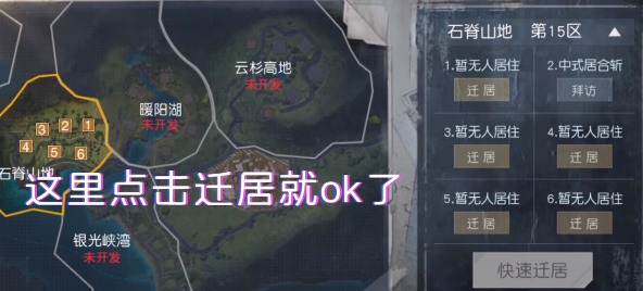 4、选好位置以后点击迁居,即可完成黎明觉醒营地搬家操作。(采取的是先到显得的规则)