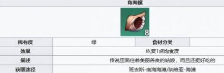 幻塔角海螺获取教程是效果是恢复1点饱食度,获取途径是班吉斯 南海海滩,纳威亚-海滩,角海螺是一个海洋生物,所以一般分布在海滩区域,在班吉斯地区的南海海滩这一块区域分布的角海螺是比较多的,还有纳威亚地区的海滩,玩家都可以采集。