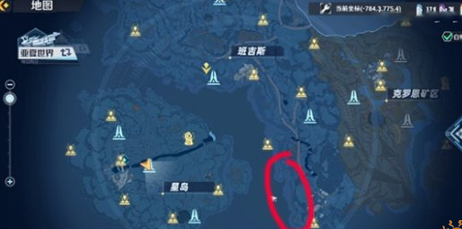 如图所示标记点:角海螺是一个海洋生物,所以一般分布在海滩区域,在班吉斯地区的南海海滩这一块区域分布的角海螺是比较多的,还有纳威亚地区的海滩,玩家都可以采集。